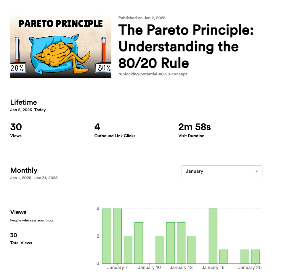 You can view more in depth analytics for a particular blog post or page simply by clicking on it which will show a breakdown of the data along with more details like where your readers are coming from, which links they are clicking, what countries they are from and more.