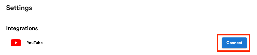 Or you can also go to Settings and click the Connect button next to the YouTube integration.