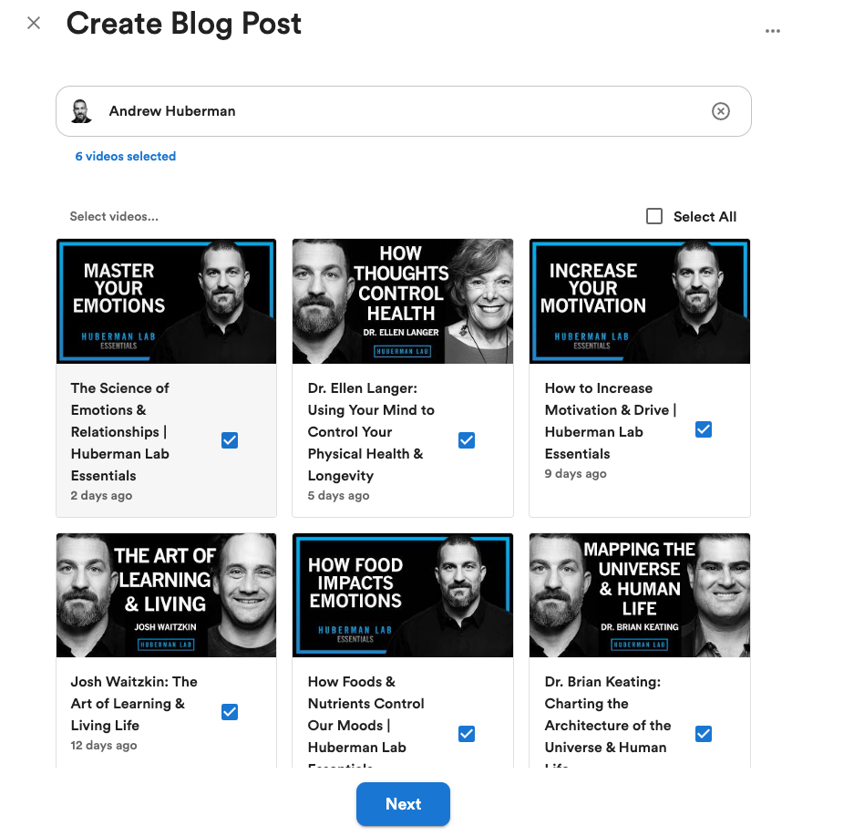 This also allows you to select multiple videos from a channel and generate multiple blog posts at once.